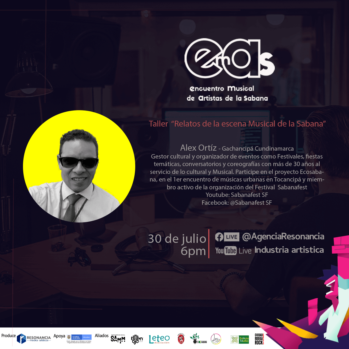 Un nuevo invitado al mercado musical de la sabana EMAS 2020 Alexander Ortiz Ortega - Gestor Cultural, Promotor Musical y organizador de eventos. Perteneciente a la organización del Festival Sabanafest, EcoSabana, organización Unión Sabana. Y al colectivo Coroto Radio de Tocancipá.