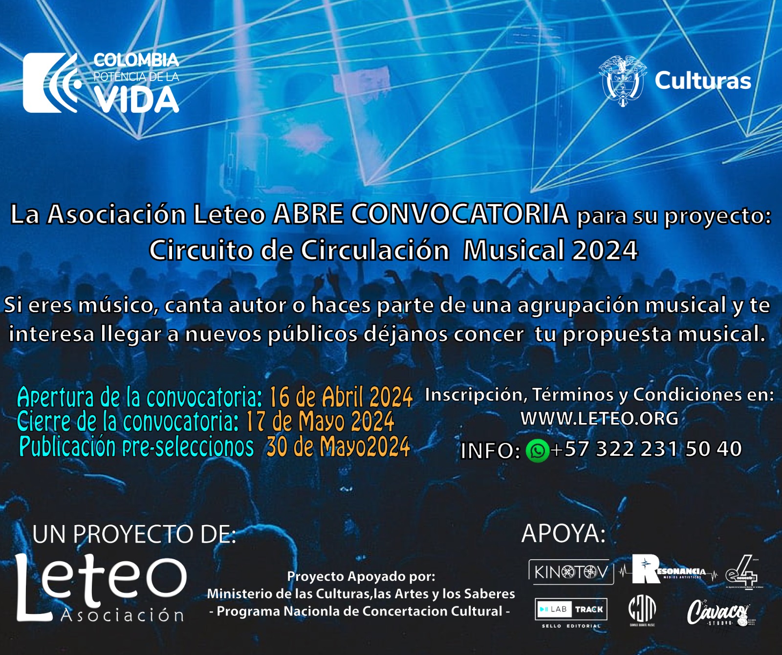 La Asociacio?n Leteo, con el apoyo del Programa Nacional de Concertacio?n Cultural del Ministerio de las Culturas, las Artes y los Saberes, ABRE CONVOCATORIA para el proyecto: Circuito de Circulacio?n Musical - 2024.