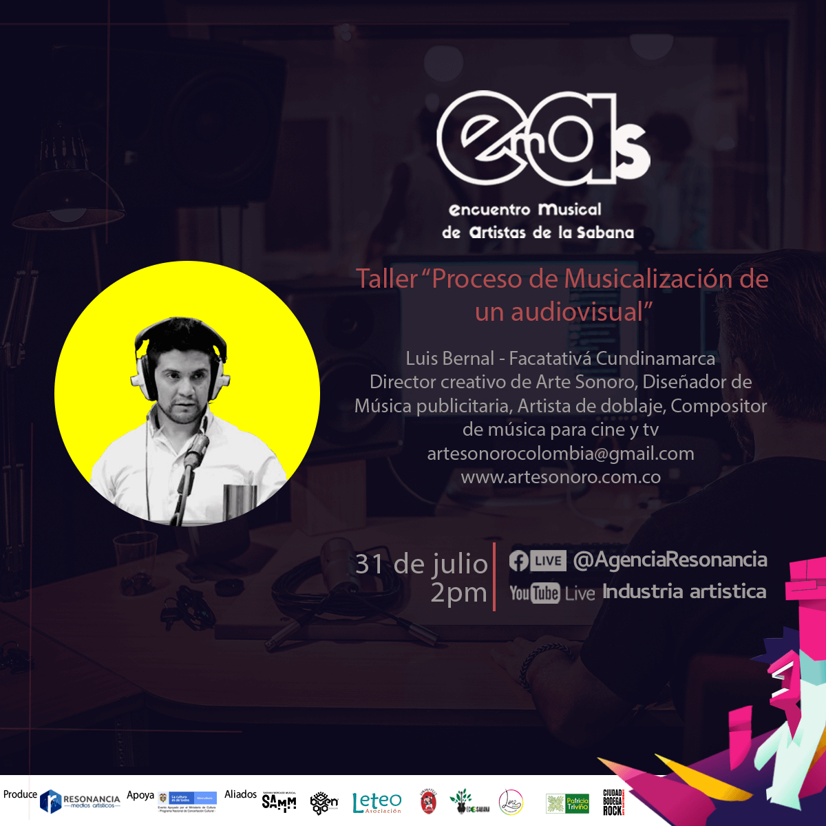 Un invitado con amplia experiencia en la composición y producción musical de Cundinamarca el tallerista Luis Enrique Bernal director musical y compositor nos invita a conocer la experiencia de la producción de música para cine hablaremos de la importancia de la música en el audiovisual su valor creativo y semiótico de los elementos narrativos y el trabajo con el director edición mezcla y masterización derechos de autor.